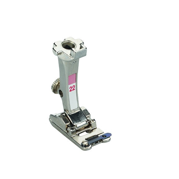 Durch seinen schwenkbaren Riegel an der Oberseite hält der Schnürchenfuss mit 3 Rillen #22 die Kordeln sicher an ihrem Platz und verhindert ein Verwickeln der Garne beim Nähvorgang.