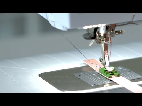 Die praktische Gleitsohle ermöglicht dabei auch bei schlecht gleitenden Stoffen ein einfaches Arbeiten. Durch die trapezförmige, grosse Aussparung kann der Stoff ungehindert transportiert werden. So kann der Stickfuss gut über kompakte Stichmuster gleiten.