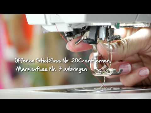 Beim Zusammennähen zweier Stoffe mit dem Markierfuss #7 wird die Fadenspannung etwas gelockert, so dass der Faden leicht über das Fadenführungsblech in der Fussmitte gleitet.
