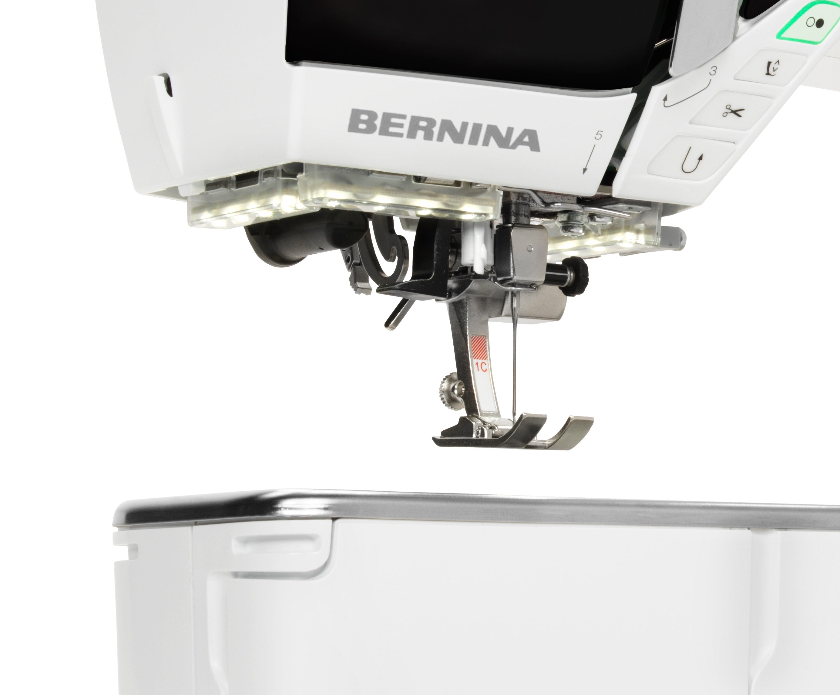 Entdecken Sie alle praktischen Details, die die BERNINA 590 mit SDT-Stickmodul so einzigartig machen. Schritt für Schritt werden wir die Maschine vorstellen: