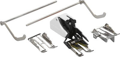 Der Obertransportfuss #50 mit drei Wechselsohlen und Kantenlineal ist ein Profi bei der Verarbeitung von anspruchsvollen Stoffen. Er eignet sich besonders gut zum Maschinenquilten sowie zum Nähen von schlecht gleitenden Materialien. Ausserdem verhindert er ein Verschieben beim Zusammennähen von gestreiften oder karierten Stoffen.